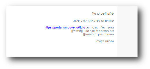 * נוסיף פעולה של שליחת מייל - כעת, כשיש לנו סיסמה שהונפקה אוטומטית, נוכל לשלוח ללקוח שלנו מייל מפורט עם פרטי הכניסה לקורס והסיסמה, כמפורט בשלב הבא כאן למטה.