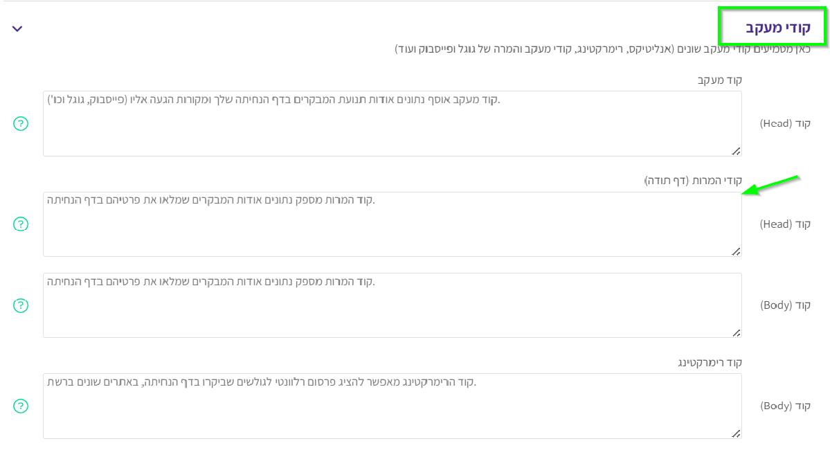 6. הדבקת קוד ההמרה בשדה ה"קודי המרות (דף תודה)"