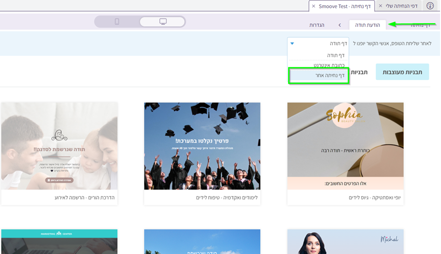 5. בחירת דף הנחיתה המשמש כדף תודה