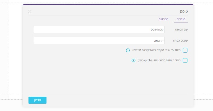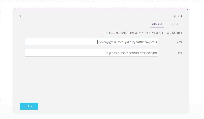 בתוך טופס הרשמת הלידים, הנמצא בדף הנחיתה, ניתן להגדיר כתובת מייל אחת או יותר, אשר יקבלו הודעה בכל פעם שנוצר ליד חדש.